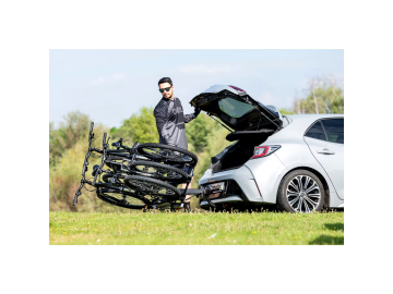 Den låsbara spak-snabblåsningen ger maximal säkerhet och skyddar mot stöld. Den praktiska fotpedalen ger smidig nedfällning av hållaren för att snabbt komma åt bagageutrymmet utan att ta av cyklarna.